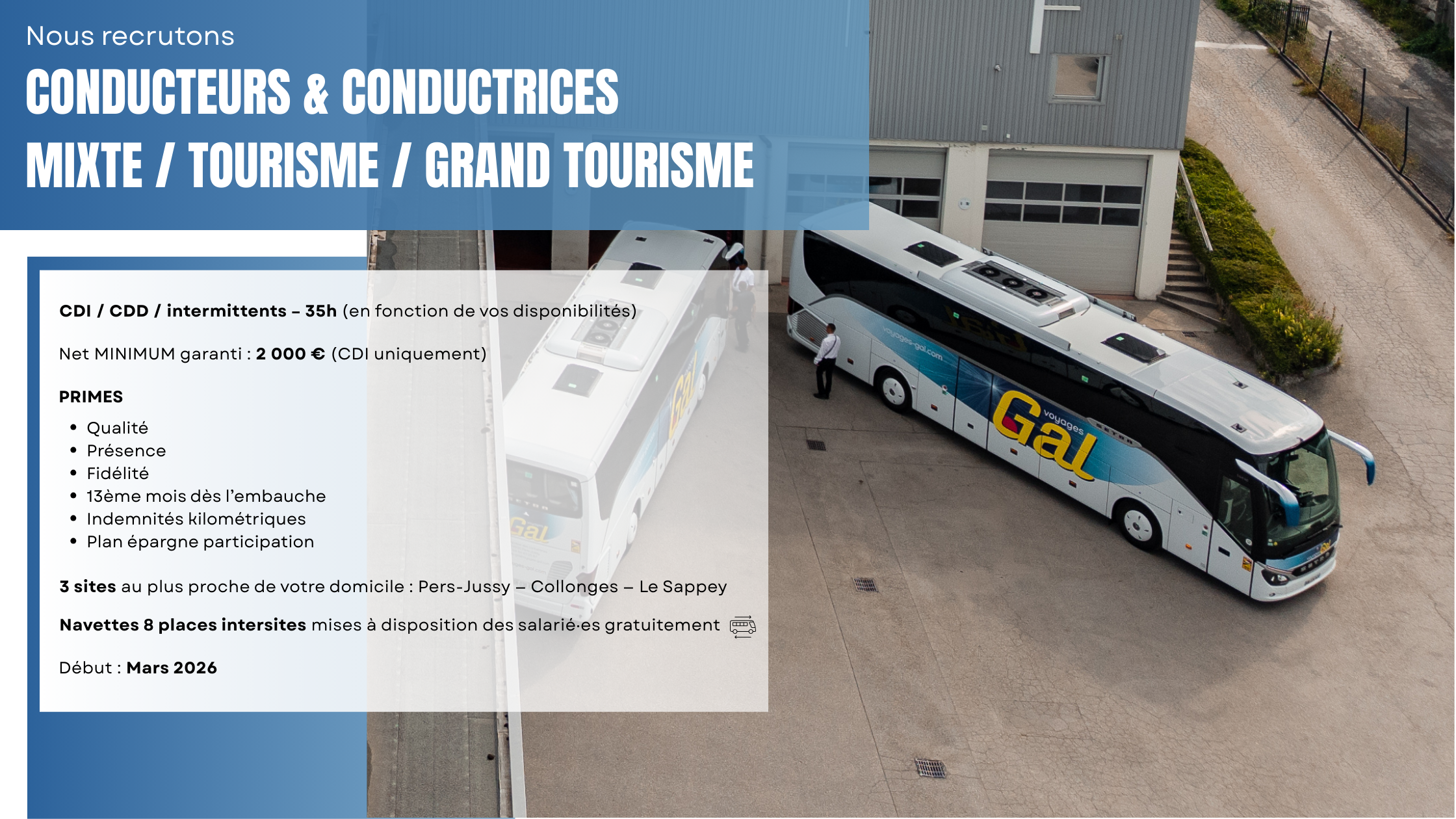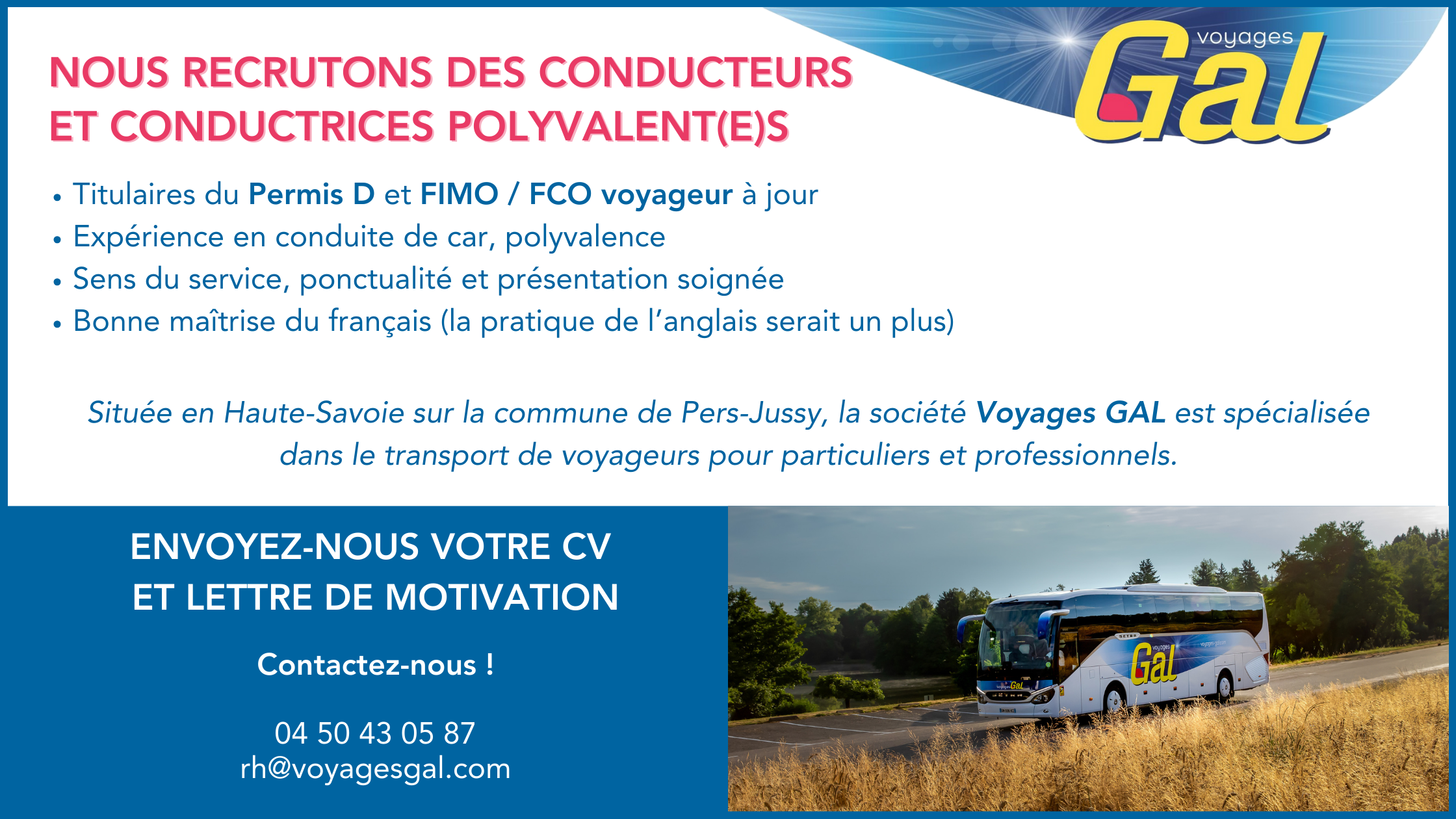 79 années d’expérience à votre service. Située en Haute Savoie à proximité de Genève, à mi-chemin entre Annemasse et La Roche sur Foron, la société Voyages GAL est spécialisée dans le transport de voyageurs pour particuliers et professionnels. Les Voyages GAL exercent 3 types de métiers: …